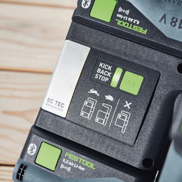 Often, even just a millisecond is crucial: The kickback is the most common cause of serious injuries when using a track saw. Our unique kickback stop therefore stops the saw blade of our cordless track saw in the blink of an eye, and so not only protects your workpiece but also helps to minimize the risk of injury to your hands.