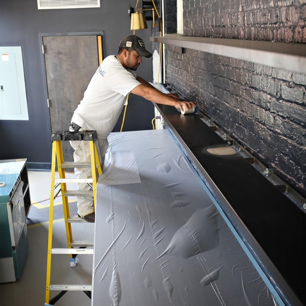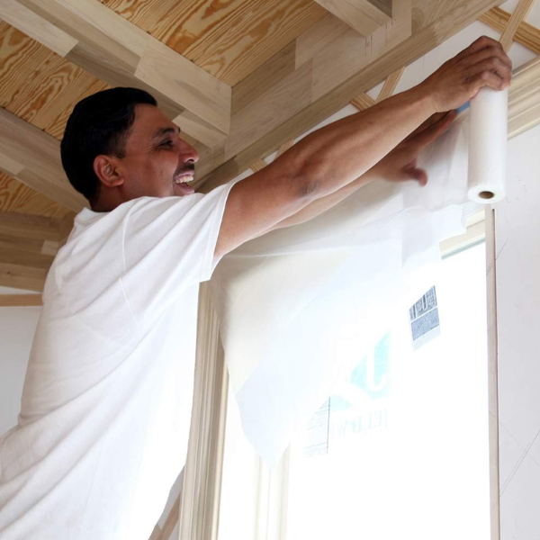 Pre-taped masking film with medium tack tape for fast reliable surface protection. The 0.5 mil high-density film clings securely to block drips, dust, and overspray.—even in windy conditions. Ideal for painting trim, protecting cabinets, and more. Available sizes 0.6 m × 22 m, 1.2 m × 22 m, 2.4 m × 22 m.